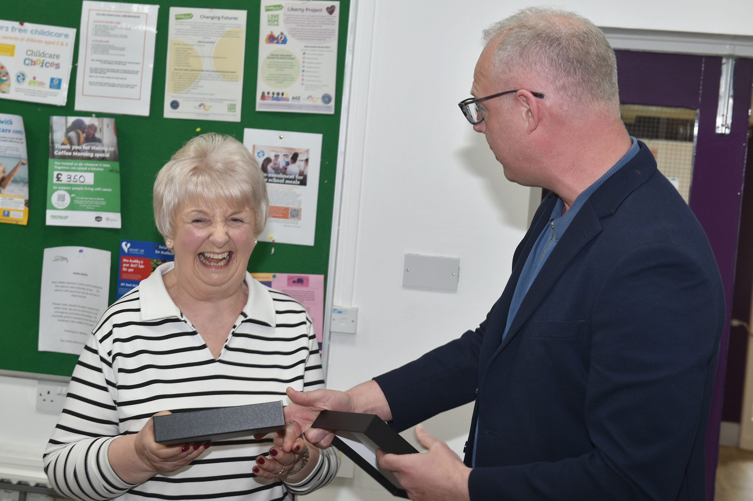 Jenny Williams from The Teesside Charity & Lee Elgie from their patron Gallagher, came along to present Barbara with her Teesside Hero Award for all the time and support she gives to Tees Valley Women’s Centre through her volunteering.
