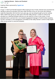 Inspiring Women Awards Redcar & Cleveland We are so incredibly proud and want to send huge congratulations to Katie Coates for winning the ‘Inspiring Others’ Award at the Inspiring Women Redcar & Cleveland Awards Ceremony on Friday.Katie first came to Tees Valley Women’s Centre at the age of 18 having recently