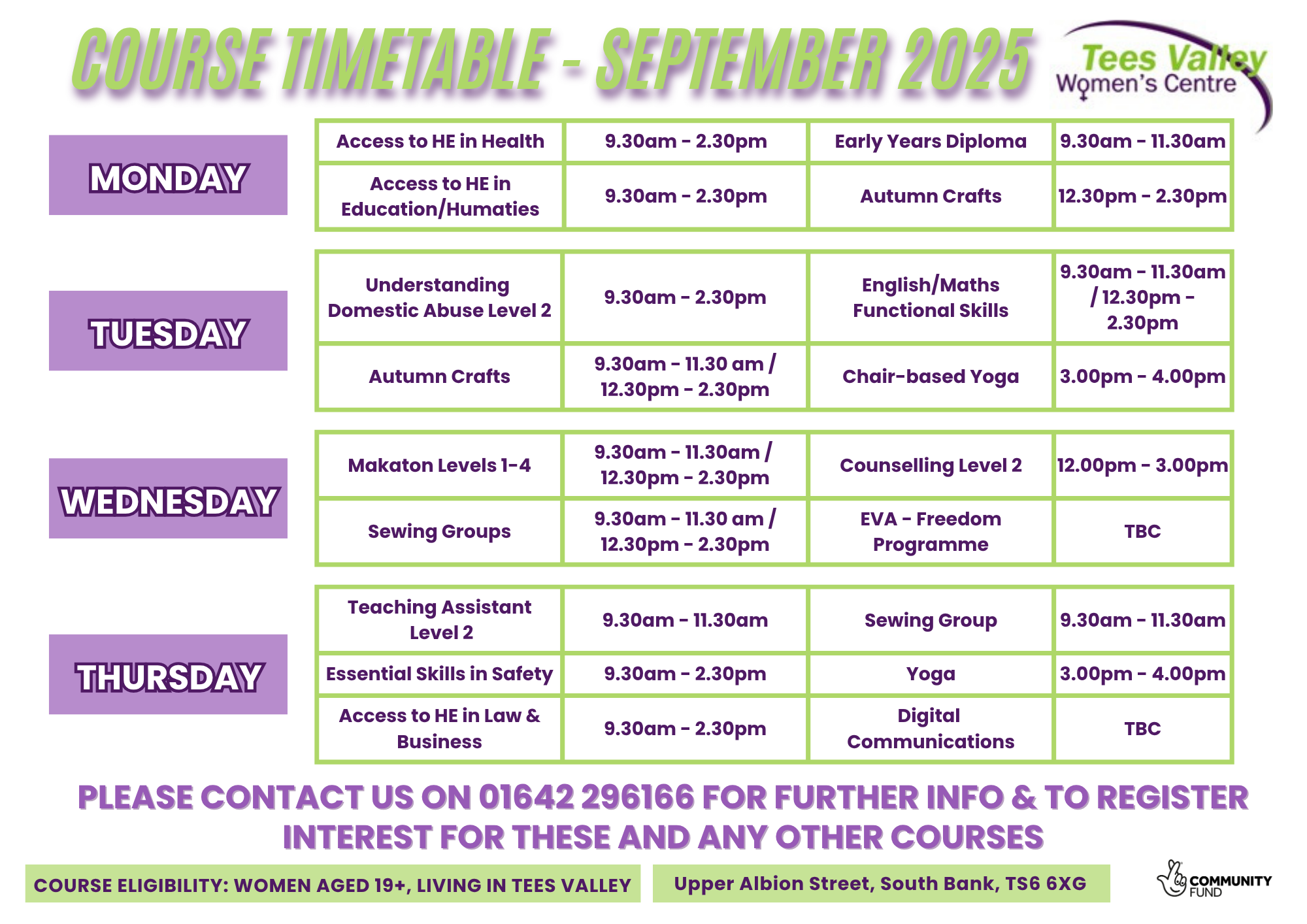 We have a fantastic range of courses commencing this September, gain new skills and qualifications in a friendly, supportive environment at Tees Valley Women’s Centre.