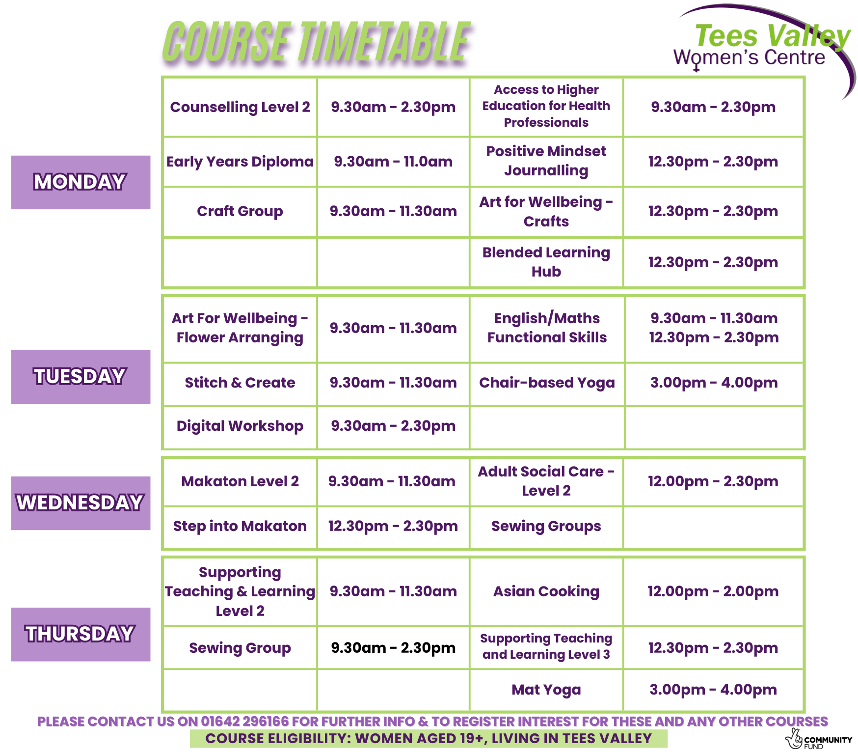 Discover new opportunities and unlock your potential with our wide range of courses at Tees Valley Women’s Centre. Whether you’re looking to build confidence, learn new skills, or gain recognised qualifications, our friendly and supportive environment is here to help you every step of the way.